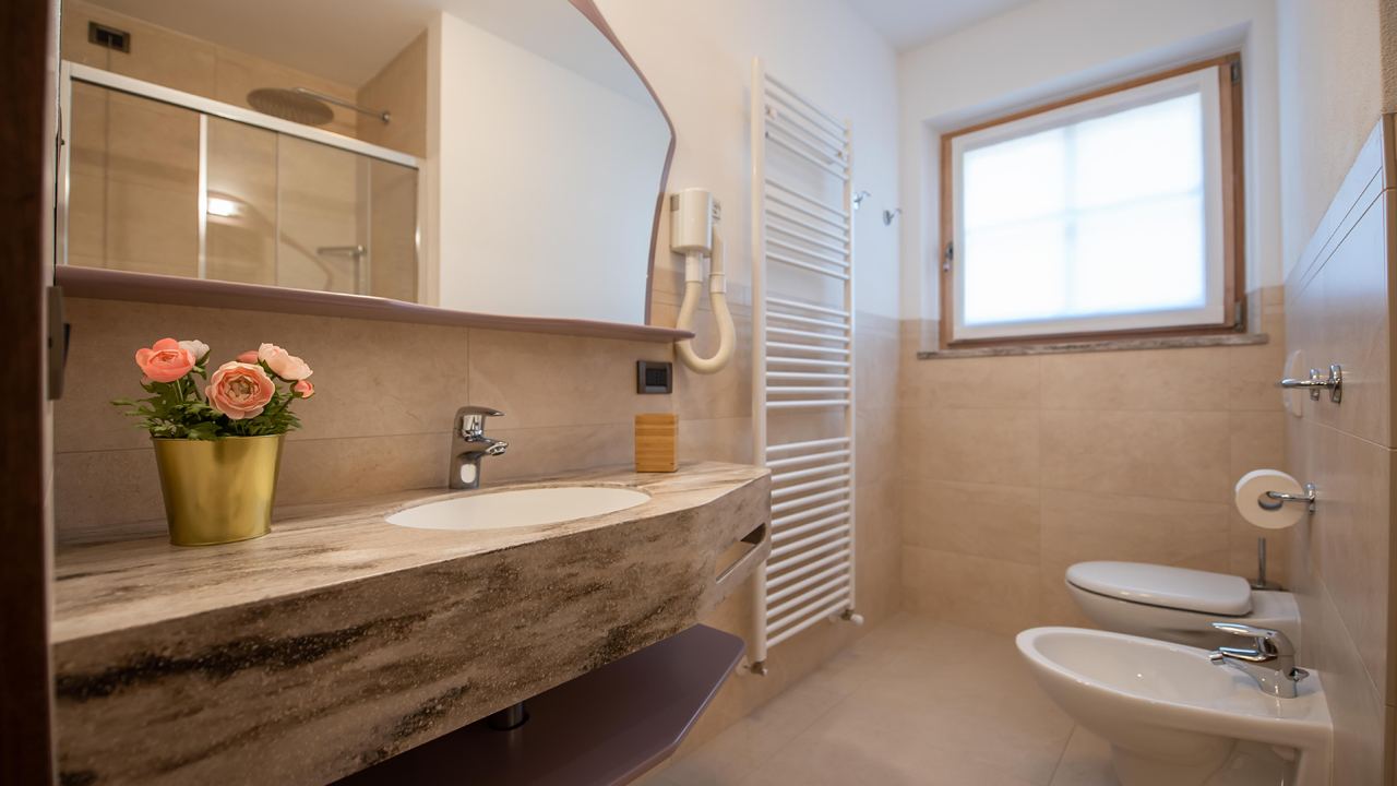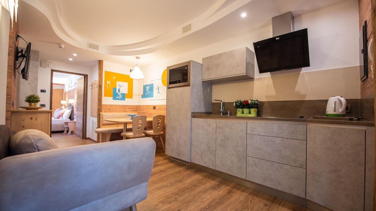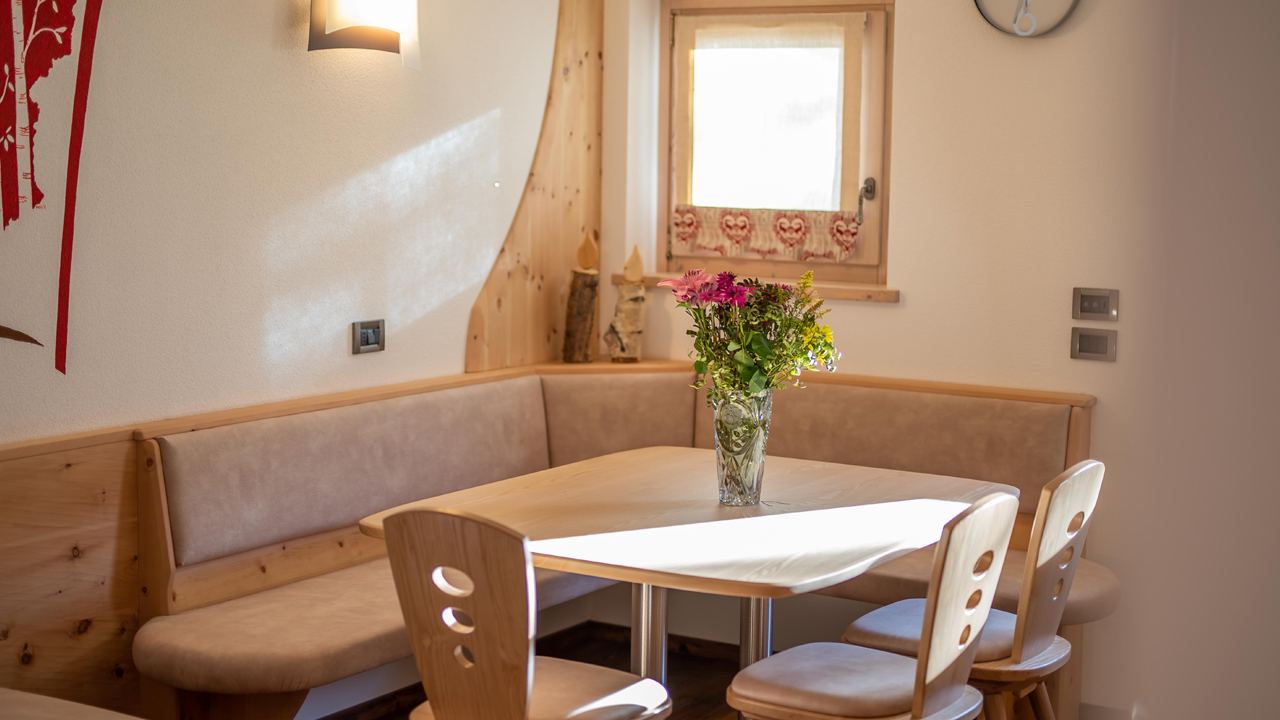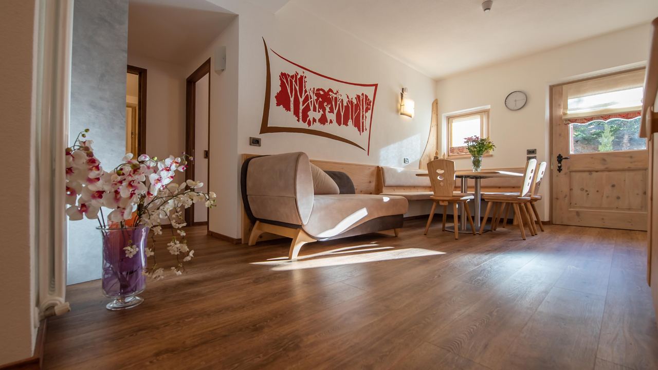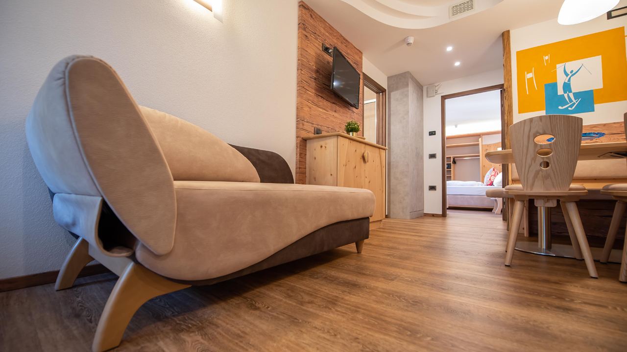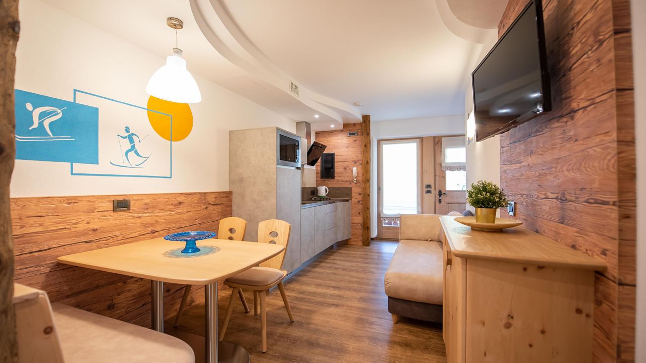 Tipico appartamento di montagna arredato in legno. Mot è composto da soggiorno con cucina, due camere da letto e due bagni. È ideale per una vacanza in coppia o con amici.