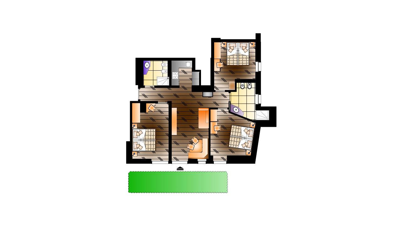 Comodo appartamento ideale sia per famiglie che per una vacanza tra amici. Situato al piano terra con ampio giardino esterno, arredato in tipico stile di montagna con vista sull'intero versante alpino di Livigno. Soggiorno con cucina, tre camere da letto e due bagni.