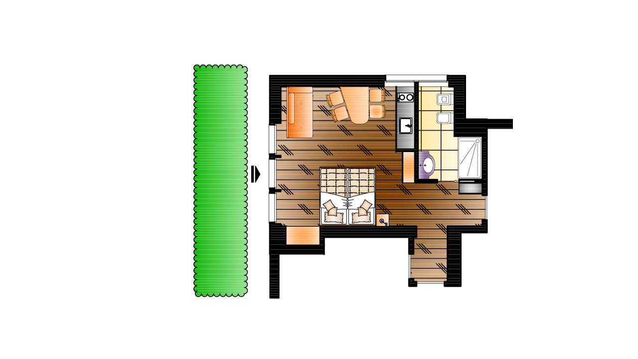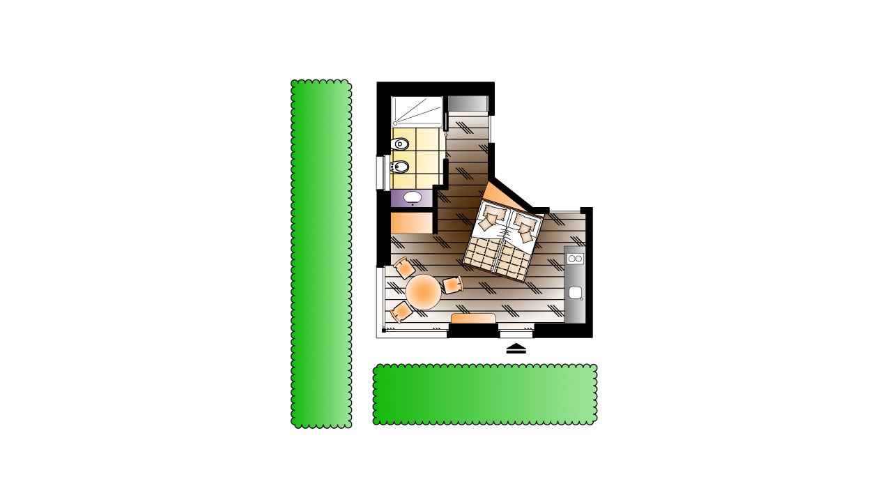 Romantico e luminoso monolocale al piano terra con patio e ampio giardino all'esterno, arredato in raffinato stile montano con vista sull'intero versante alpino di Livigno. Dispone di un letto matrimoniale, angolo cucina e bagno. Forcola è ideale per una vacanza in coppia.